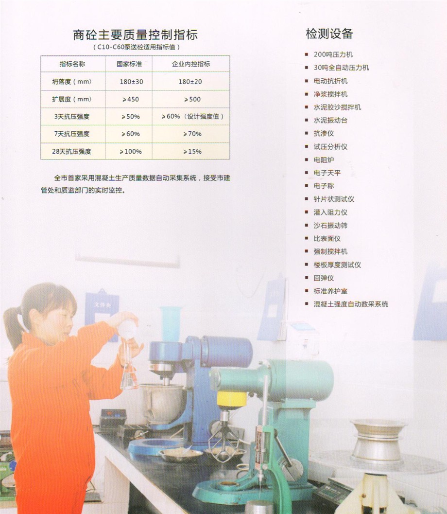 公司設(shè)有先進(jìn)的實(shí)驗(yàn)室,配備全套混凝土及原材料檢測(cè)試驗(yàn)設(shè)備,配有專職的試驗(yàn)、檢驗(yàn)人員,可承擔(dān)混凝土的材料性能試驗(yàn),工藝質(zhì)量控制、產(chǎn)品質(zhì)量檢驗(yàn)等全部試驗(yàn)、檢驗(yàn)項(xiàng)目,為確;炷临|(zhì)量提供了可靠的保證。